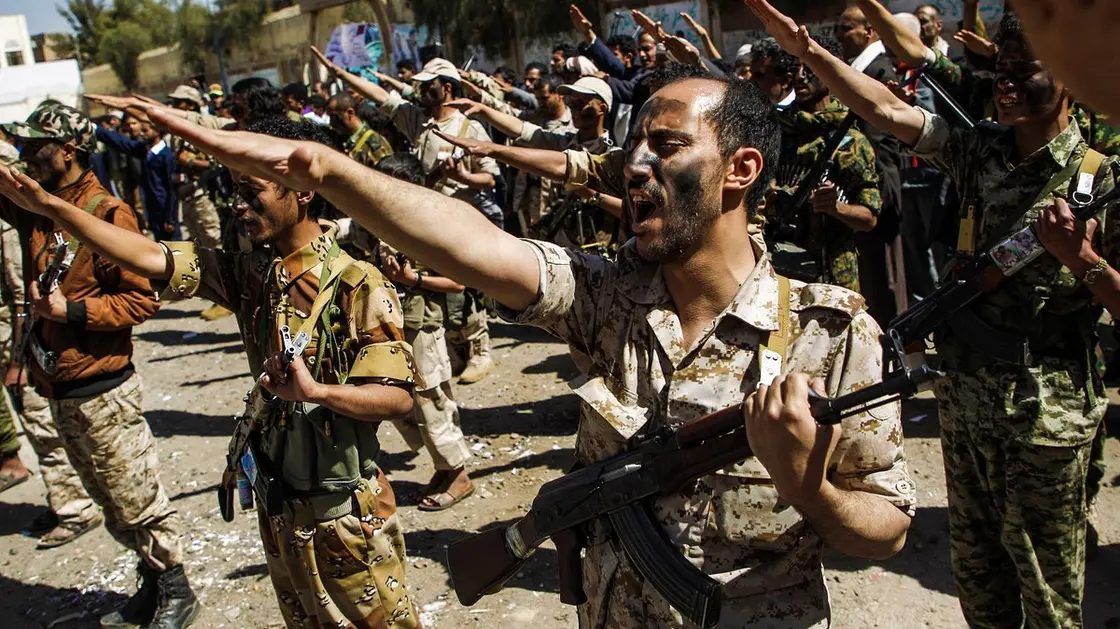 PICTURED: Newly recruited Houthi fighters chant slogans and don the Nazi-like salute during a gathering in the capital Sanaa. (File Photo: Mohammed Huwais/AFP). Their slogan , modeled on a motto from revolutionary Iran, is: "Allah is the Greatest, Death to America, Death to Israel, A Curse Upon the Jews, Victory to Islam". In a curious and controversial move the Biden administration withdrew the designation of the Iran- sponsored Houthis as a terrorist organization - but according to sources is reevaluating that decision.